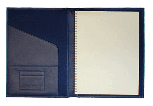 Features: Full-grain leather journal notebooks. Made of genuine leather. Covers are completely hand stitched and turned edges and foam-padded. Inside has a document flap, pen slot and business card pockets. Holds an 8 1/2" x 11" notebook or letter size pad, with both vertical and horizontal slots on the right side. Wirebound notebook with 160 ruled or blank pages included.