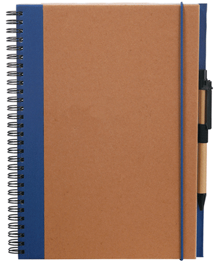 Features: Recycled double spiral notebooks journals with pen combo. Ballpoint pen is made out of recycled paper and corn starch. Journal is made out of cardboard with double spiral binding, elastic pen loop on cover and 80 white lined sheets. 70% recycled hard cover and 50% recycled interior.